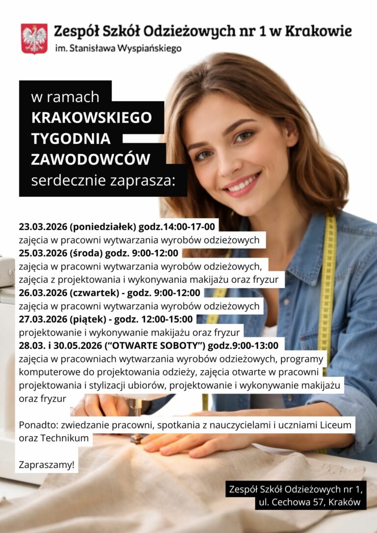 Zapraszamy do udziału w zajęciach w ramach Tygodnia Zawodowców w Zespołu Szkół Odzieżowych nr 1 w Krakowie