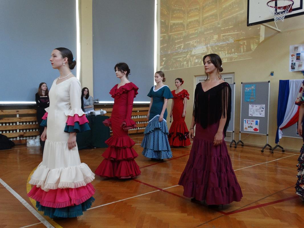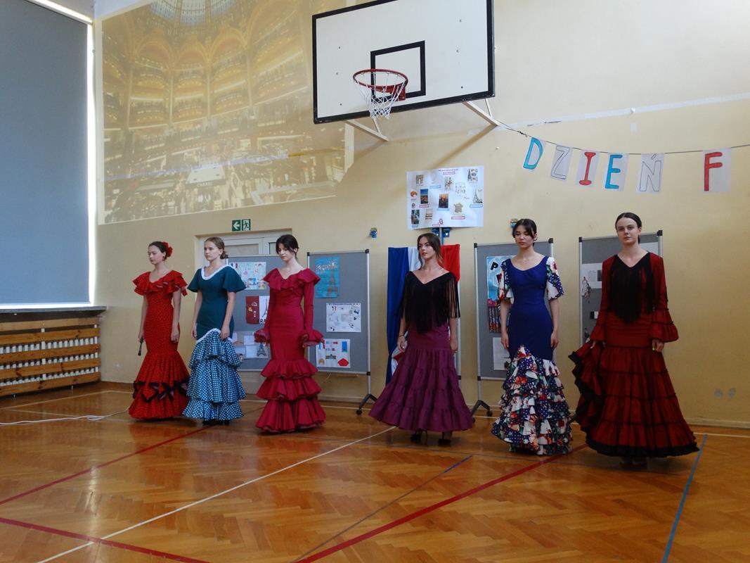 Paryż to kolebka mody, tak więc podczas święta Francji, nie mogło zabraknąć pokazu mody. Szkolne „modelki” zaprezentowały kolekcję sukien flamenco, uszytych podczas tegorocznych praktyk zawodowych w Sewilli oraz kolekcję naszego ucznia Filipa .