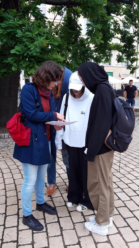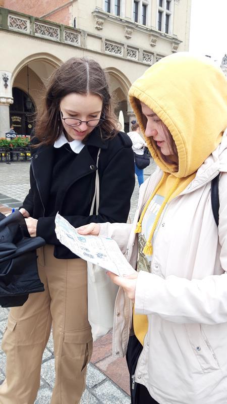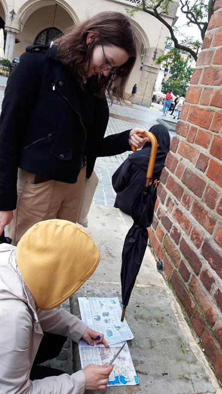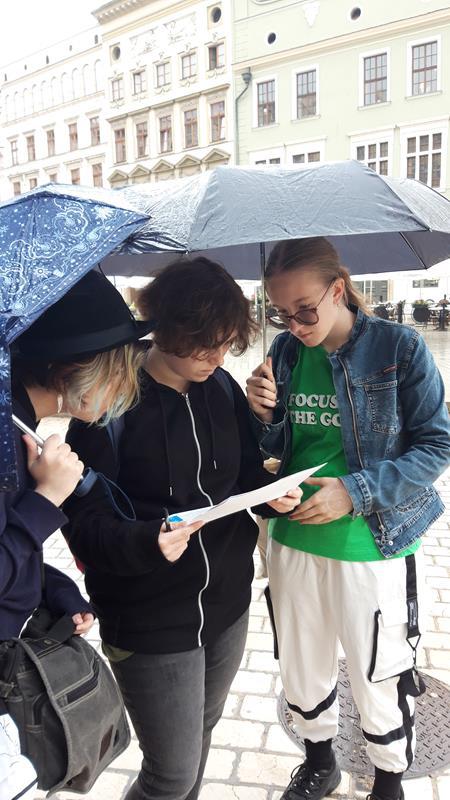 Mimo niesprzyjającej pogody nasza młodzież tropiła na Rynku Głównym znaki i szukała wskazówek, które pozwoliłyby jej zwyciężyć w grze terenowej, rozszyfrowując łacińskie hasło.