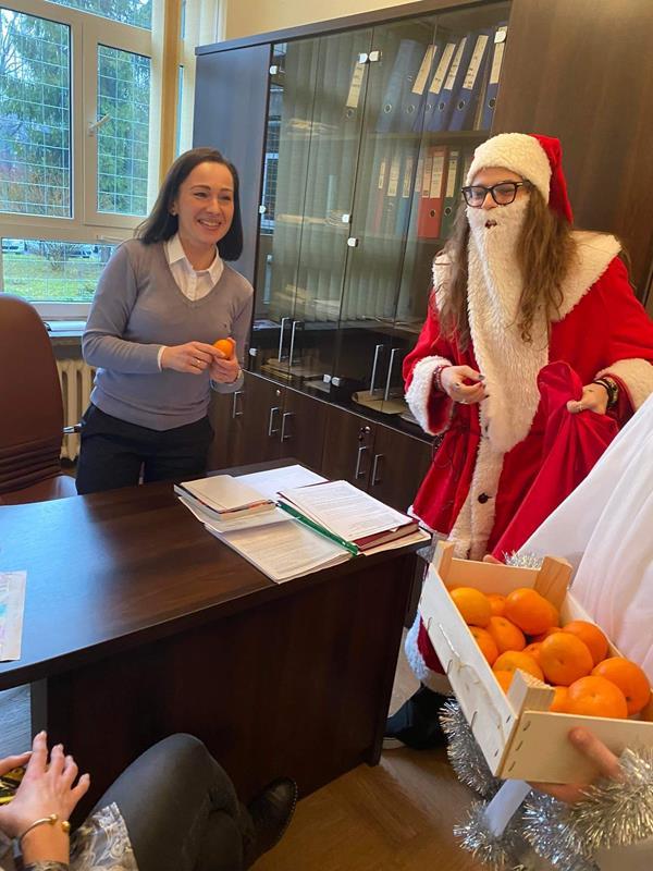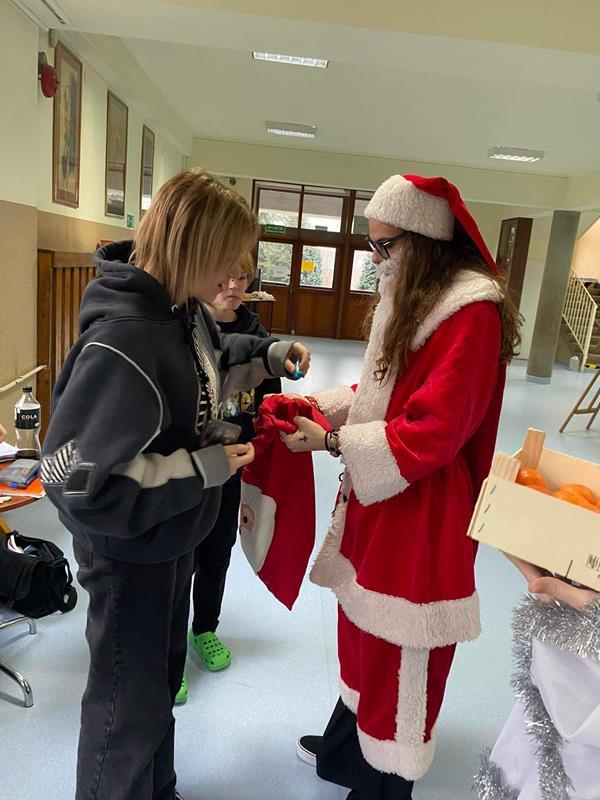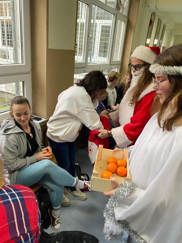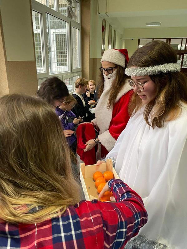 2022-12-13 Aktualności Mikołaj z Aniołkiem Tradycyjnie już jak co roku w naszej szkole 6 grudnia chodził Mikołaj z Aniołkiem. Okazało się, że wszyscy byliśmy grzeczni !!! Mikołaj nikogo nie pominął, każdy otrzymał coś słodkiego, a dbający o linię – mandarynkę.