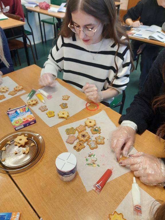 Jak co roku młodzież bardzo chętnie przystąpiła do ozdabiania pierników i ciasteczek różnorodnymi wzorami. Wykorzystując swoje umiejętności plastyczne tworzyli z lukru i posypek bałwanki, aniołki, rentierki i domki.